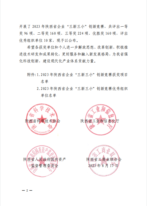 “三新三小”主要指企業經營活動中的“新技術、新工藝、新材料”和“小發明、小創新、小改造”。“三新三小”創新競賽由陜西省科學技術協會、陜西省工業和信息化廳、陜西省人民政府國有資產監督管理委員會、陜西省工商業聯合會共同主辦,是圍繞產業鏈部署創新鏈、圍繞創新鏈布局產業鏈,引導企業弘揚創新文化、營造創新氛圍、傳播創新方法、激發創新熱情的省級創新競賽活動,且競賽項目必須是已經在企業中實現全落地、有效運行一年以上、取得一定社會經濟效益的創新成果。