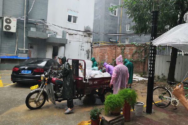 上午8時許,大雨傾盆,持續性降雨使小區多處路面出現較高積水,為及時處理隱患,有效確保小區居民人身、財產安全,物業公司應急搶險隊按照預案展開救援。他們冒雨行動,根據各自分工,排水堵漏。
